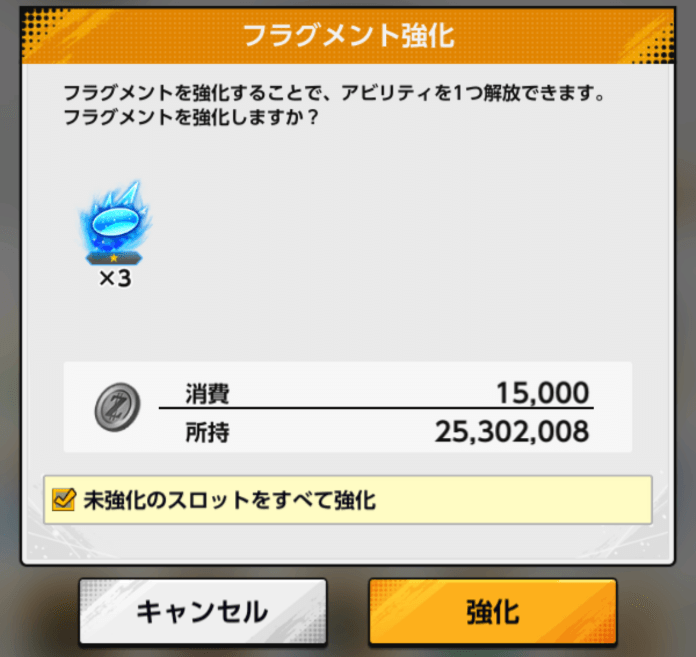 フラグメントの強化をより簡便にするため、「未強化のスロットをすべて強化」にチェックを入れて強化を実行することで、未強化のスロットをまとめて強化できるようにしました。