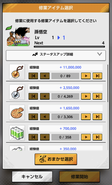 キャラクターレベルアップの負担を軽減するため、従来の修業地を撤廃し、キャラクターを選択して修業アイテムを使用することでレベルアップができるようにしました。